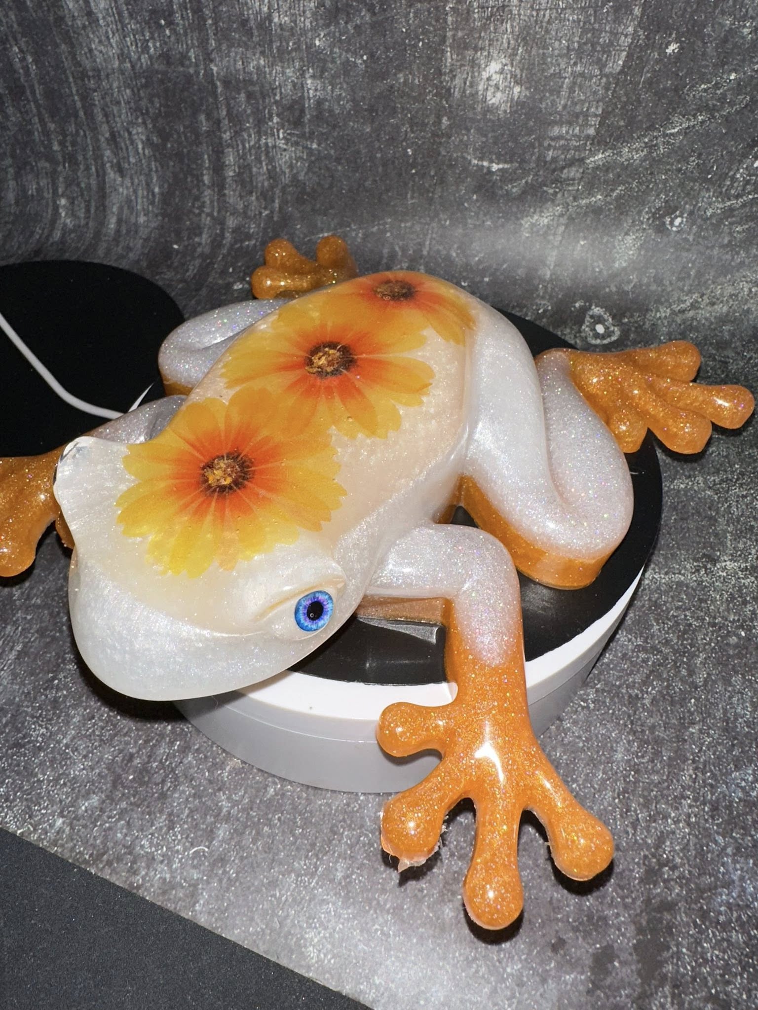 Beautiful Epoxy/Resin Extra large frog. This beauty was so much fun to create. Has yell and white Mecha powder inside the resin with 3 Sunflowers down the back. I hope you love this as much as i loved making it.