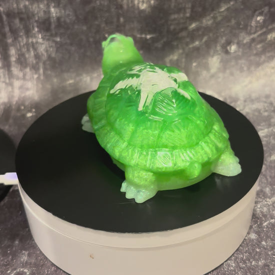 3d Sea Turtle made out of resin. 5.55 in in length/5.2 inches in height/3.94 inches in width. Has a white starfish on his back. Cute little guy looking for a new home. Made of resin, with green mica powder and white mica powder on the bottom with a bit of sparkle.